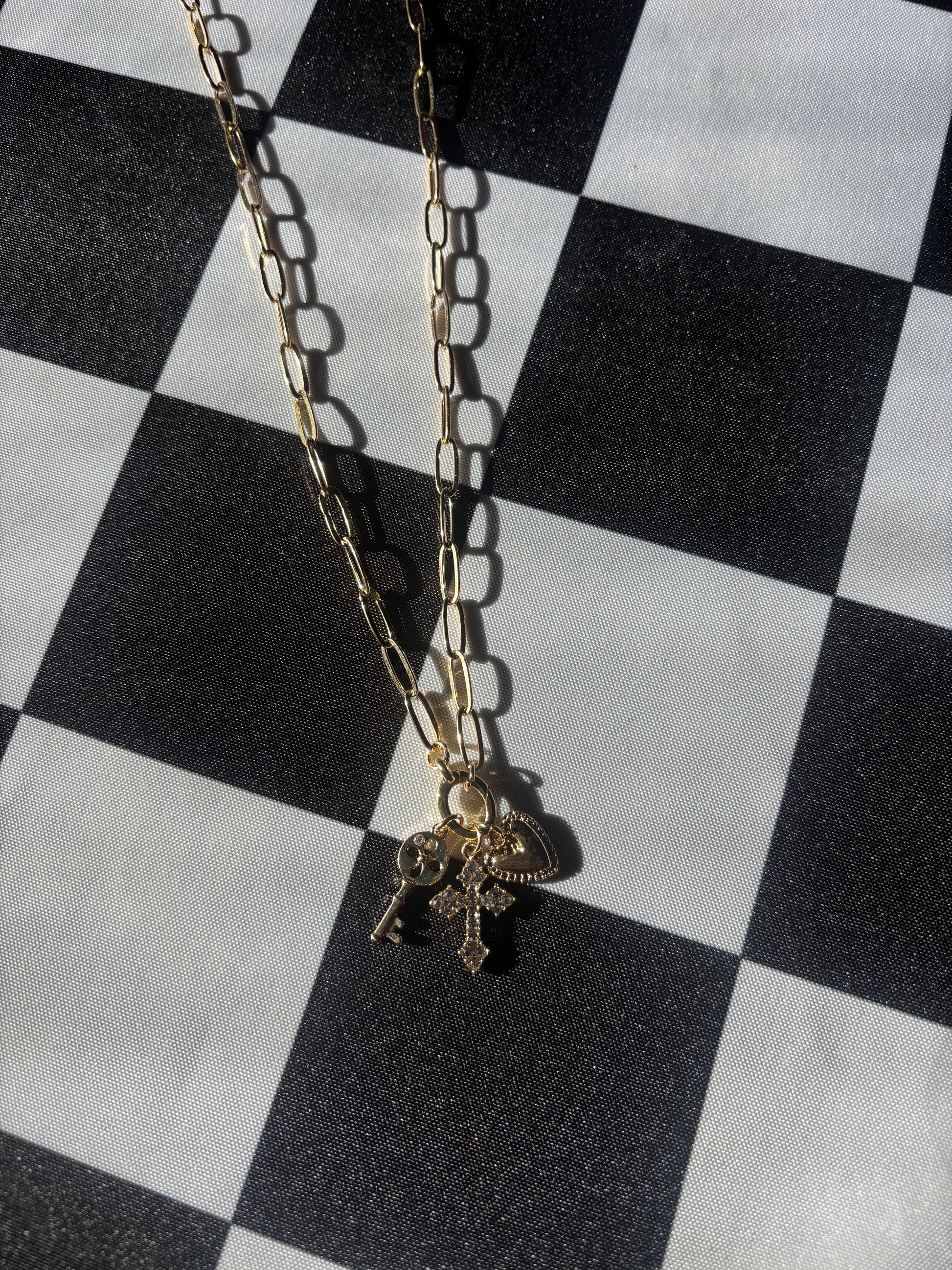 Add a touch of timeless elegance to your look with the Juliet Crystal Pendant Necklace. This gold-toned piece features a stylish paperclip chain and three delicate charms — a sparkling crystal key, a shimmering bow, and a polished heart. Each charm catches the light beautifully, making this necklace perfect for both everyday wear and special occasions.