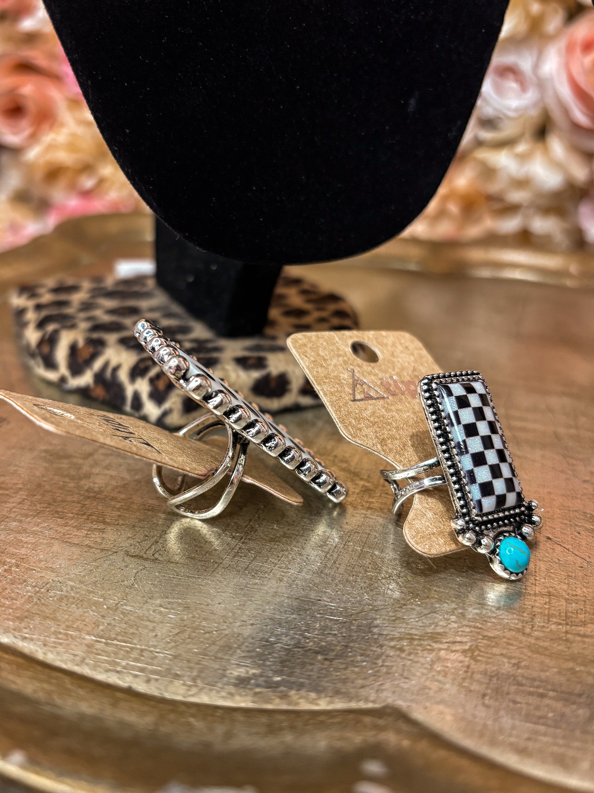 This chic checkerboard ring blends classic Western elements with modern style. Designed with a black-and-white checkered center framed in antique silver detailing, it’s finished with a pop of turquoise at the base for a perfect touch of color. Adjustable and lightweight, it’s an easy everyday piece with boutique flair.